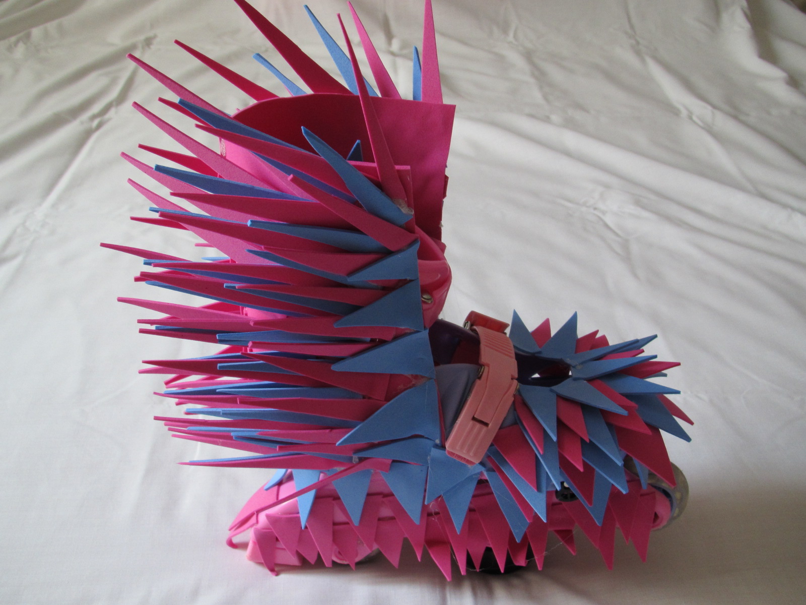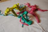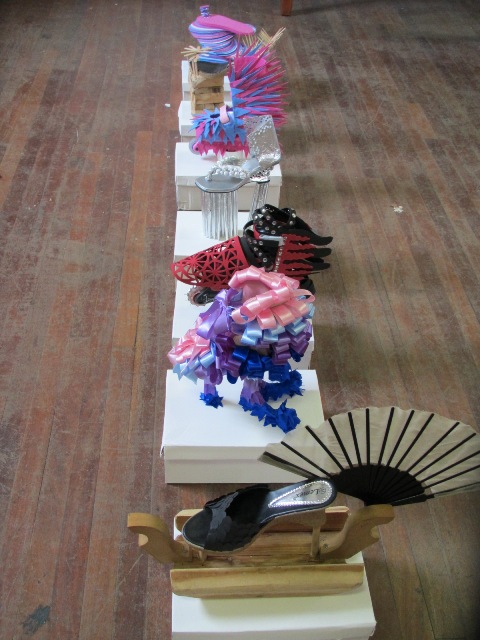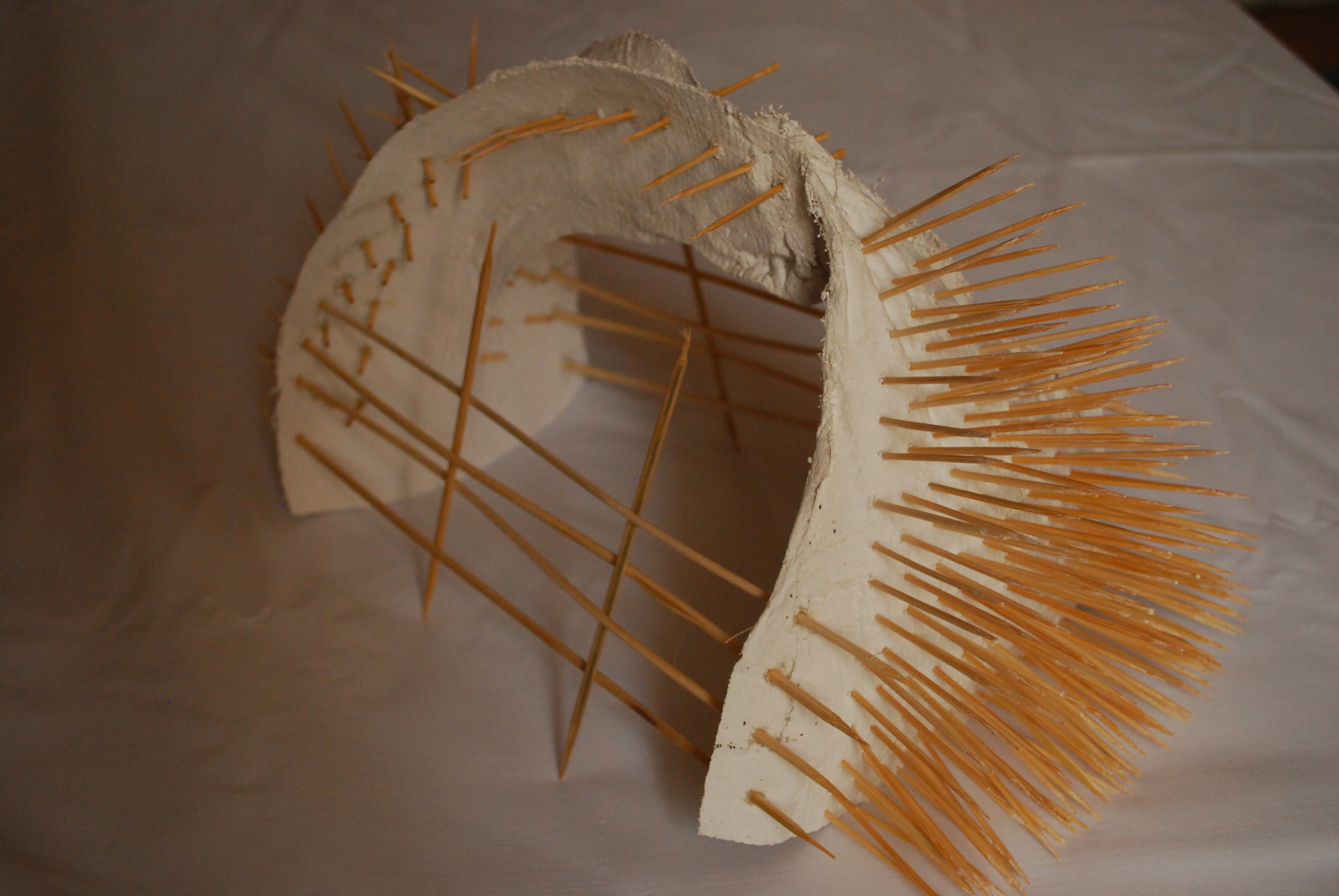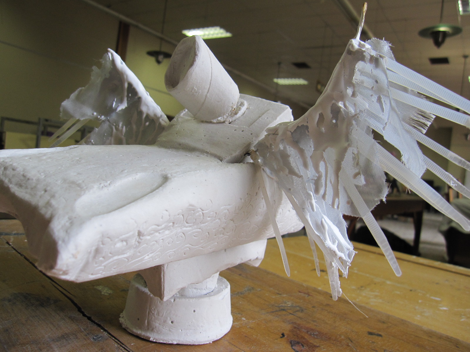 paper mache sheets, feathers, wool plastic tubing paper, newspaper plaster of paris cast