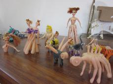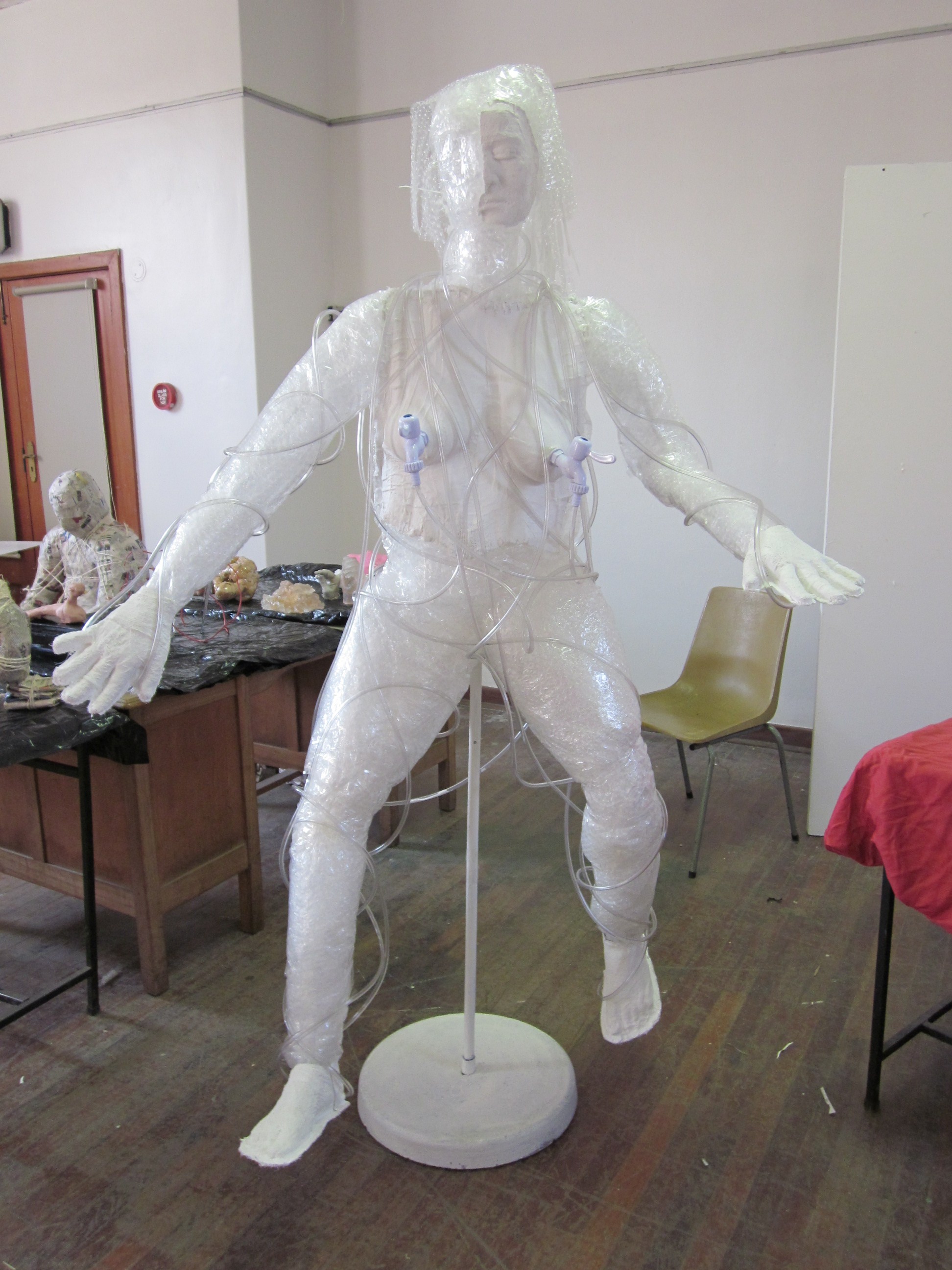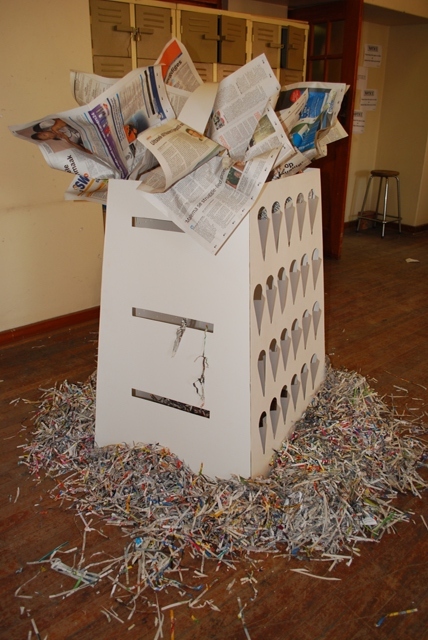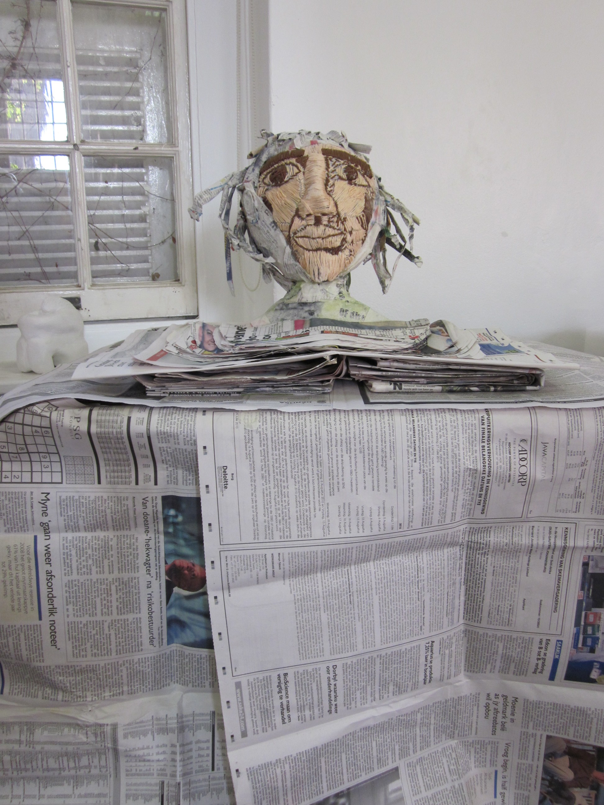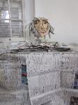 Newspaper head Handmade life size doll Bubble wrap statue Paper cheese grater Fantasy vehicle